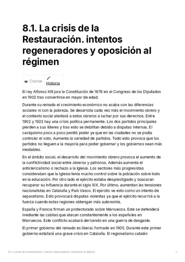 He publicado nuevos apuntes de Historia de España: 8.1.-La-crisis-de-la-Restauracion.-intentos-regeneradores-y-oposicion-al-regimen.pdf