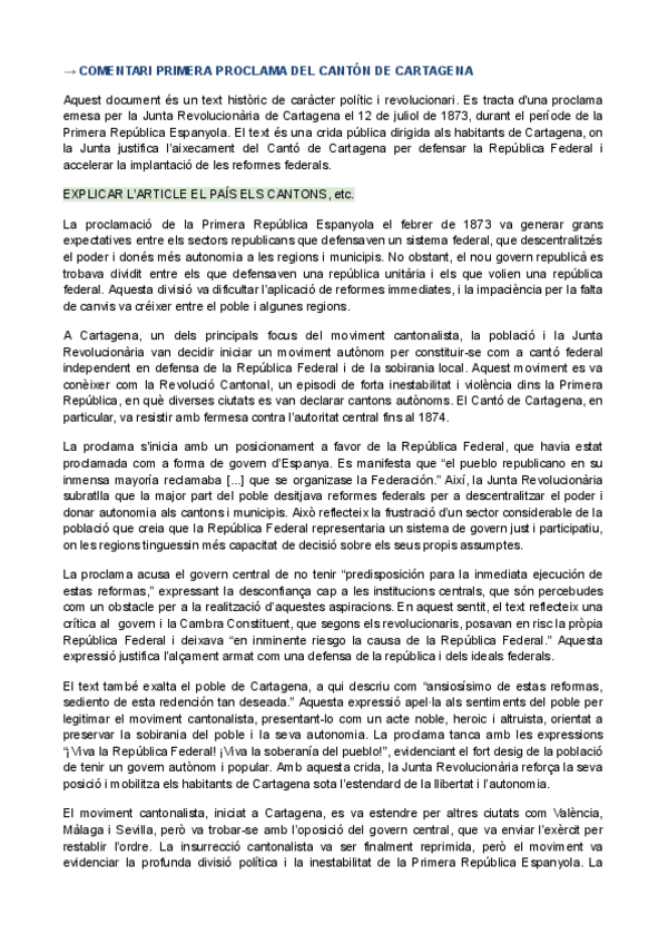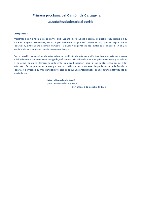 HISTÒRIA D'ESPANYA COMENTARI DE TEXT PARCIAL 2: Primera proclama del Cantón de Cartagena_