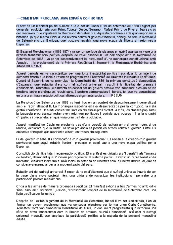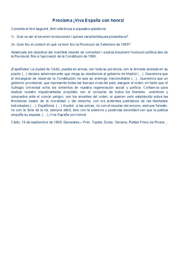 HISTÒRIA D'ESPANYA COMENTARI DE TEXT PARCIAL 2: Proclama ¡Viva España con honra