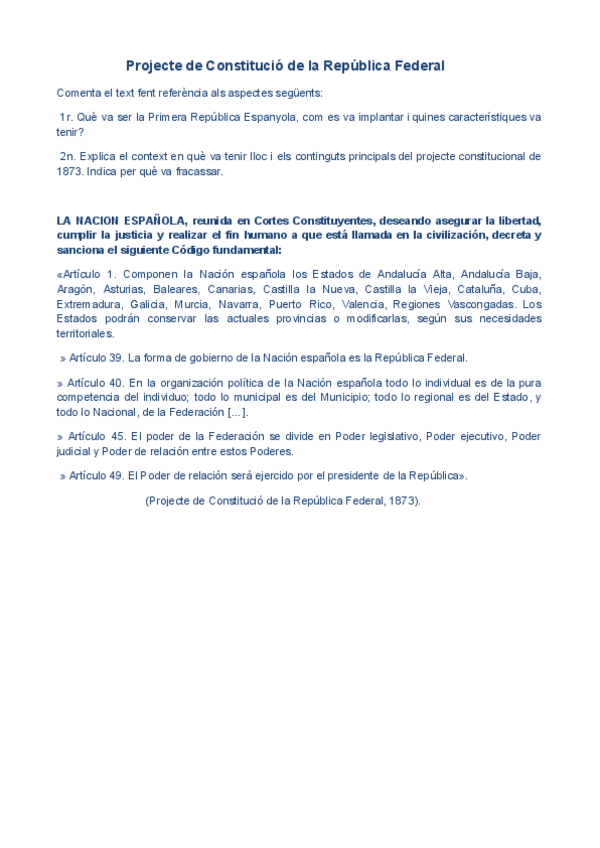 HISTÒRIA D'ESPANYA COMENTARI DE TEXT PARCIAL 2: Projecte de Constitució de la República Federal
