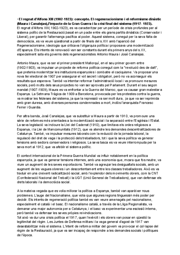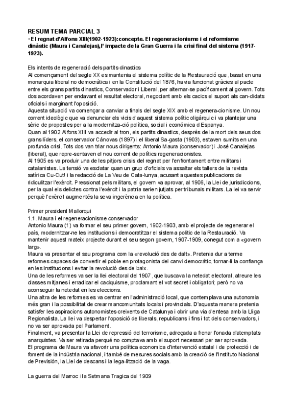 HISTÒRIA D'ESPANYA TEMA PARCIAL 3: El regnat d’Alfons XIII (1902-1923)_ concepte. El regeneracionisme i el reformisme dinàstic (Maura i Canalejas),l'impacte de la Gran Guerra i la crisi final del sistema (1917- 1923).