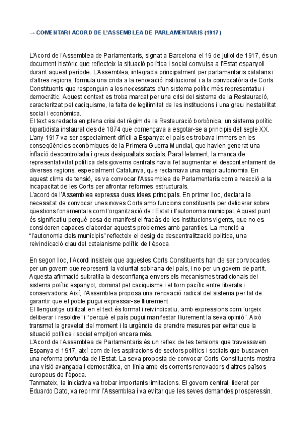 HISTÒRIA D'ESPANYA COMENTARI DE TEXT PARCIAL 3: Acord de l’Assemblea de Parlamentaris (1917)