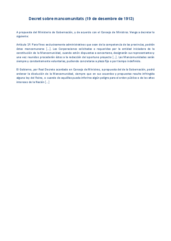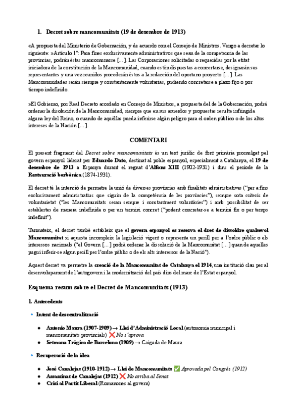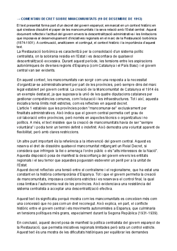 HISTÒRIA D'ESPANYA COMENTARI DE TEXT PARCIAL 3: Decret sobre mancomunitats (19 de desembre de 1913)