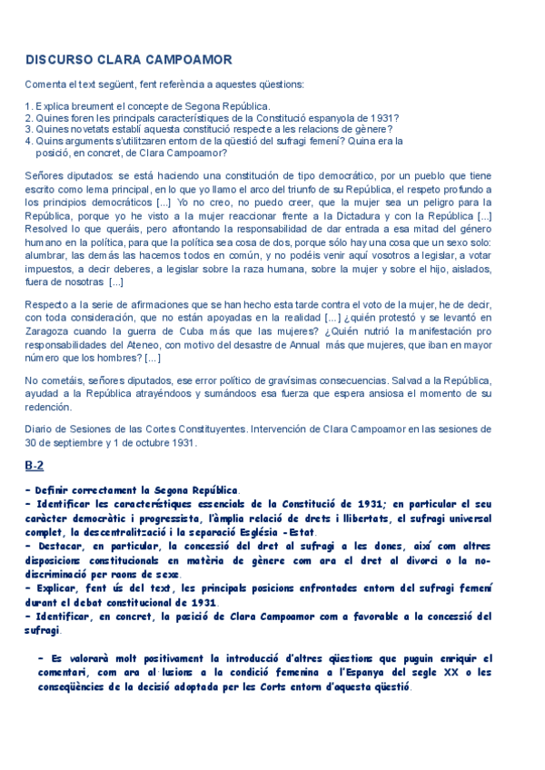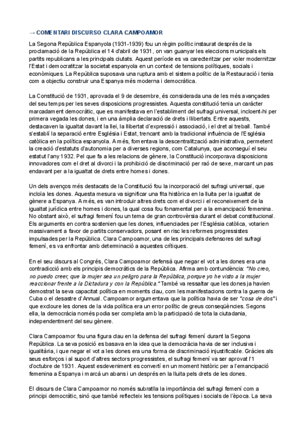 HISTÒRIA D'ESPANYA COMENTARI DE TEXT PARCIAL 3: DISCURSO CLARA CAMPOAMOR