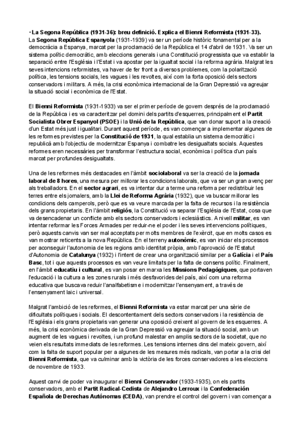 HISTÒRIA D'ESPANYA TEMA PARCIAL 3: La Segona República (1931-36)_ breu definició. Explica el Bienni Reformista (1931-33).