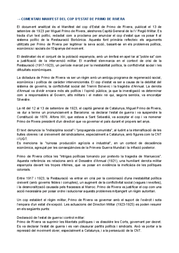 HISTÒRIA D'ESPANYA COMENTARI DE TEXT PARCIAL 3: Manifest del cop d’Estat de Primo de Rivera