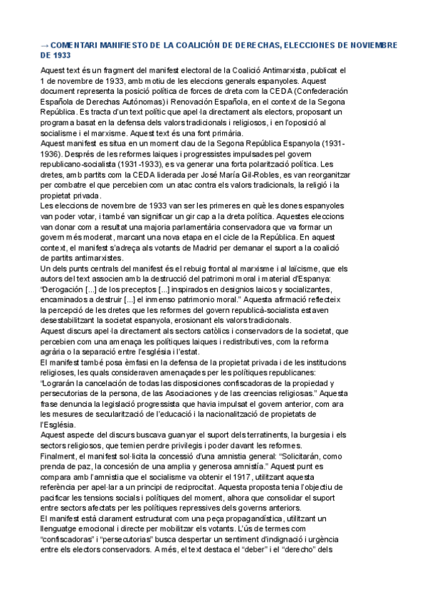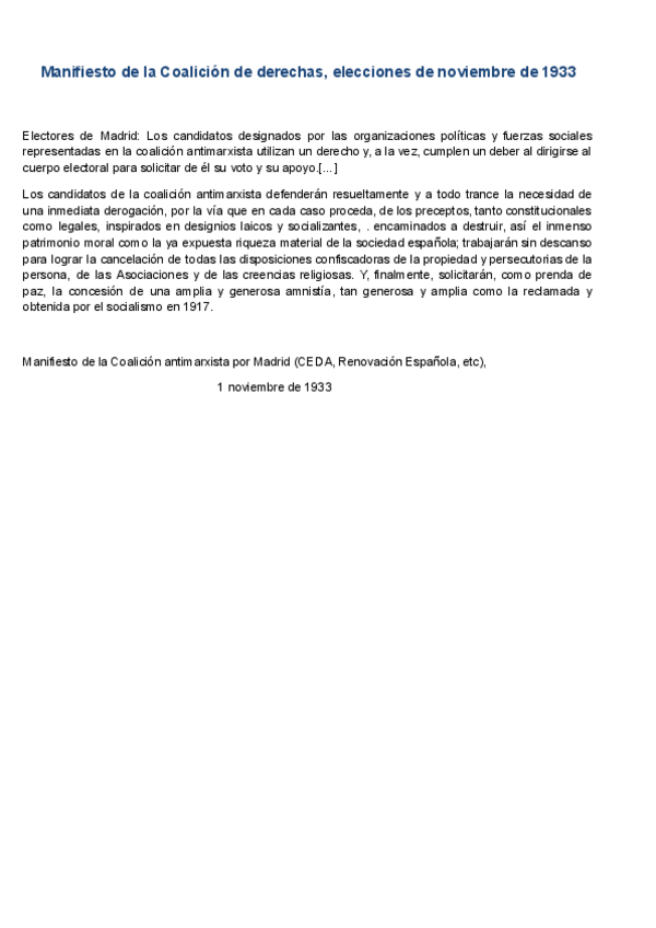 HISTÒRIA D'ESPANYA COMENTARI DE TEXT PARCIAL 3: Manifiesto de la Coalición de derechas, elecciones de noviembre de 1933