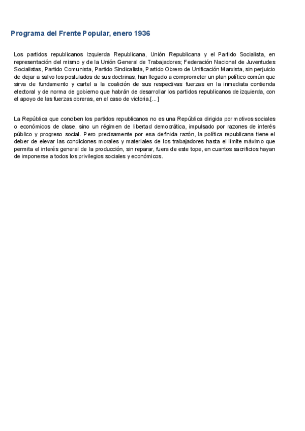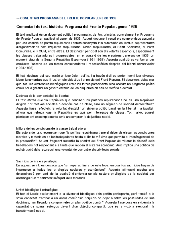 HISTÒRIA D'ESPANYA COMENTARI DE TEXT PARCIAL 3: Programa del Frente Popular, enero 1936