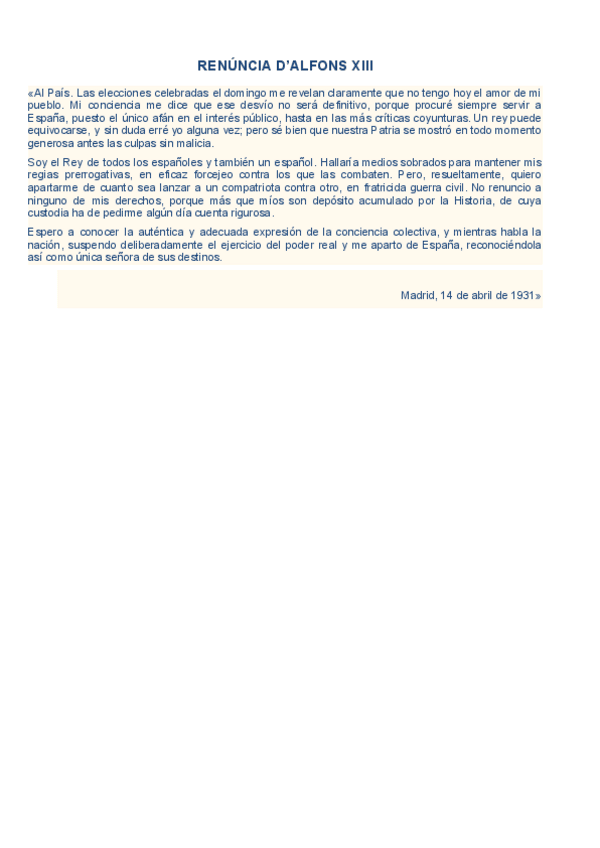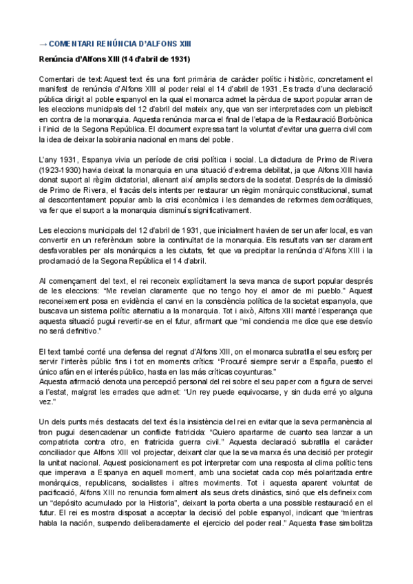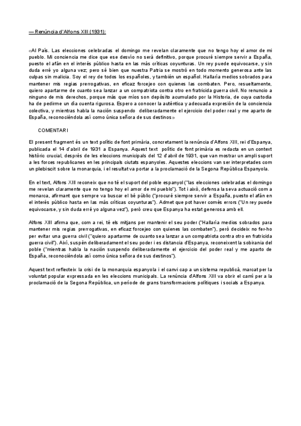 HISTÒRIA D'ESPANYA COMENTARI DE TEXT PARCIAL 3: RENÚNCIA D’ALFONS XIII