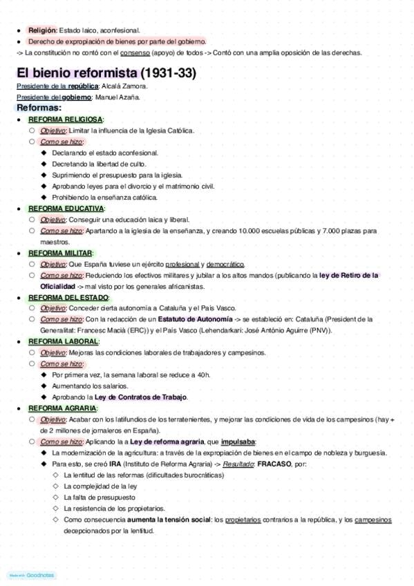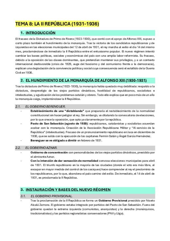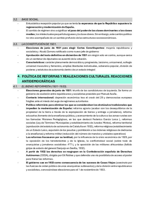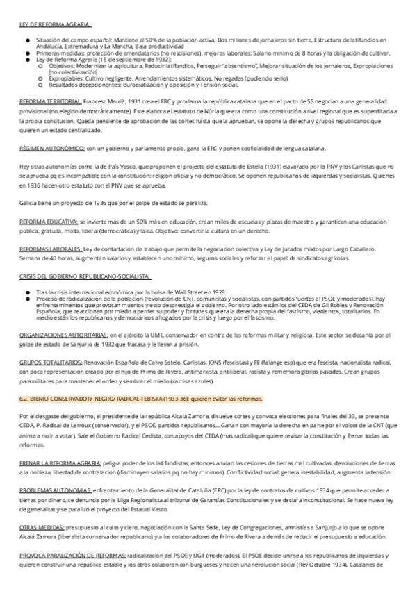 Segunda República Española: antecedentes, la proclamación, Gobierno provisional, constitución de 1931, bienio reformista (reformas y problemas), bienio conservador (+ características), el frente popular (+ características).