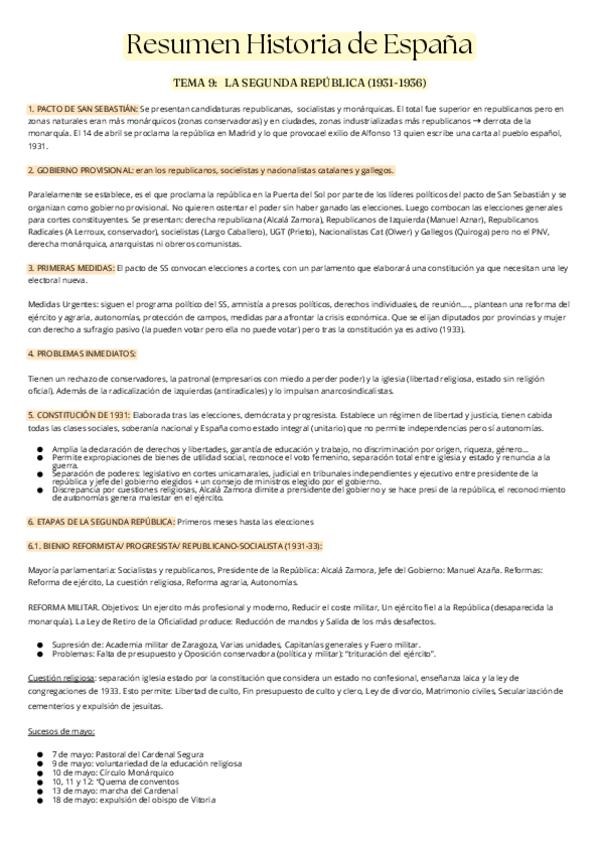 Resumen Historia de España T9 La Segunda República 1931 - 1936 Pacto de San Sebastián Reformas Bienio Progresista Bienio Conservador