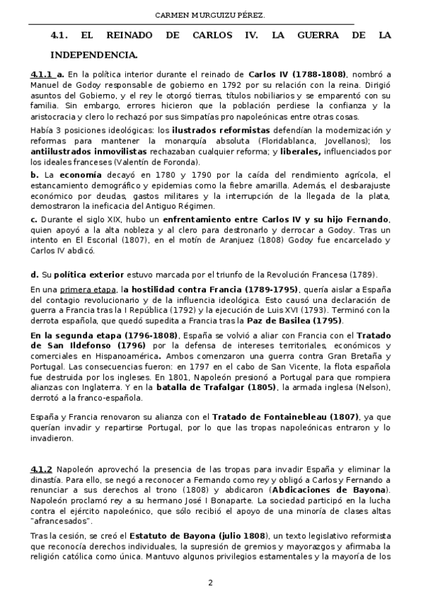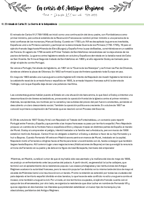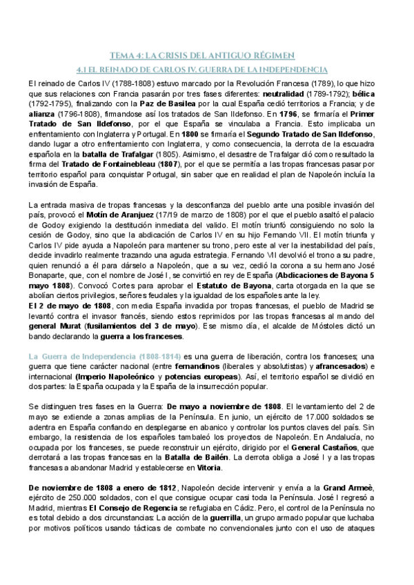 Apuntes del Tema 4.1. de Historia para la PAU (601 palabras). Bloque B. El siglo XIX español. Tema 4. La crisis del Antiguo Régimen (1788-1833). 4.1. El reinado de Carlos IV. La Guerra de la Independencia.