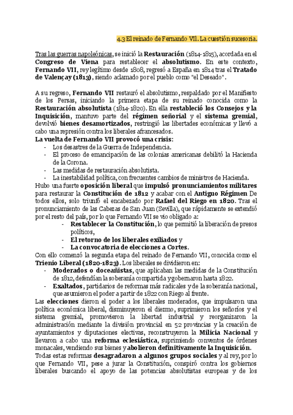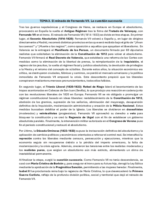 Redacción con extension y contenidos recomendados del TEMA 3. El reinado de Fernando VII. La cuestión sucesoria. para PAU Madrid 2026