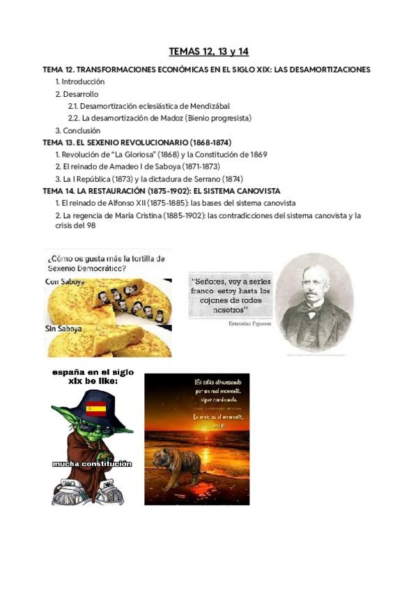 Apuntes de los temas: - TEMA 12: TRANSFORMACIONES ECONÓMICAS EN EL SIGLO XIX: LAS DESAMORTIZACIONES - TEMA 13: EL SEXENIO REVOLUCIONARIO (1868-1874) - TEMA 14: LA RESTAURACIÓN (1875-1902): EL SISTEMA CANOVISTA Resumidos y redactados para el examen y saca