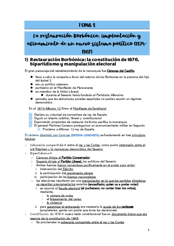 HISTORIA- TEMA 8 - RESTAURACIÓN BORBÓNICA
