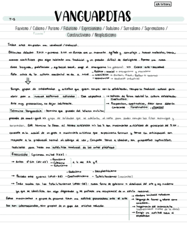 Apuntes del tema 5 (Vanguardias). Contiene marcadas las partes con más probabilidad de salir en examen.