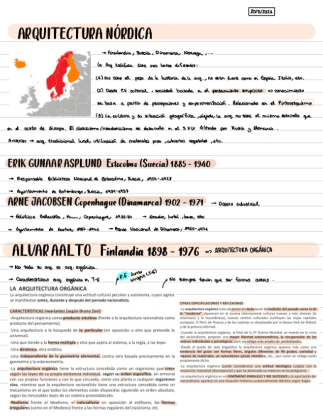 Apuntes del tema 10 (La arquitectura nórdica). Contiene marcadas las partes con más probabilidad de salir en examen.