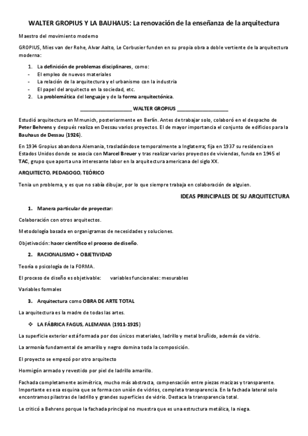 Apuntes del tema 7 (Gropius y la Bauhaus). Contiene marcadas las partes con más probabilidad de salir en examen.