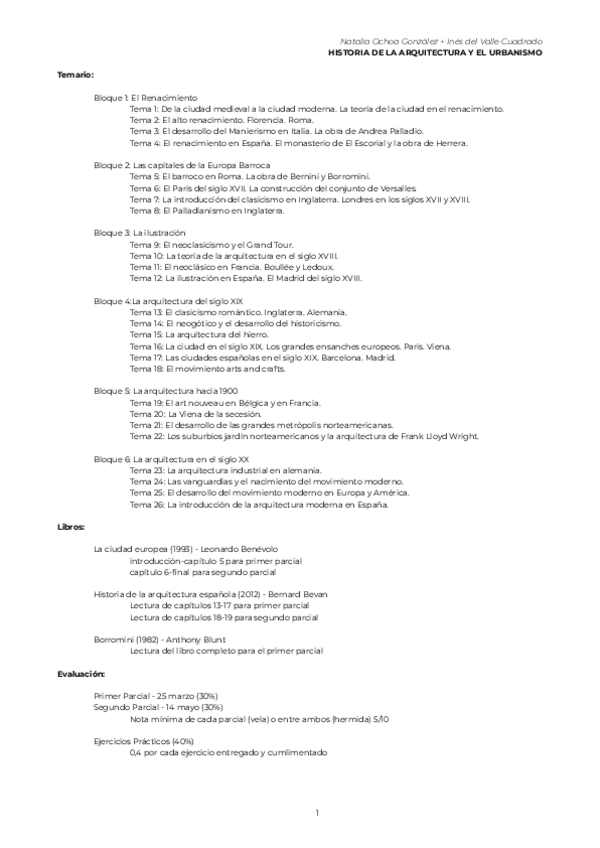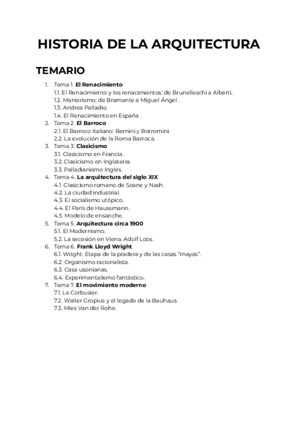 Tema 2: El Barroco (desde el París Barroco) / Tema 3: La Ilustración / Tema 4: La arquitectura del SXIX / Tema 5: Arquitectura cercana a 1900 / Tema 6: Arquitectura SXX
