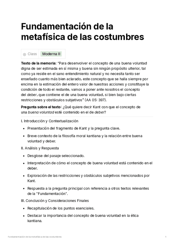 Resumen de las ideas de la Primera y Segunda sección de la FMdlC de Kant