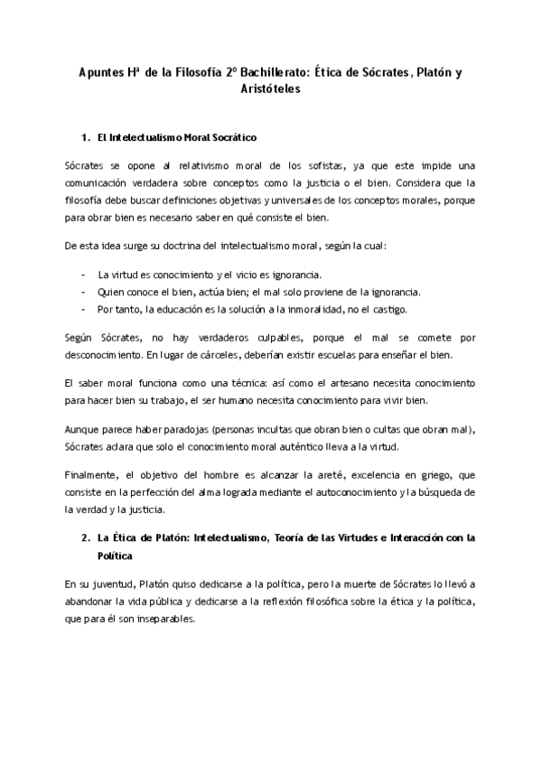 Apuntes Ética de Sócrates, Platón y Aristóteles Hª de la Filosofía 2º Bachillerato