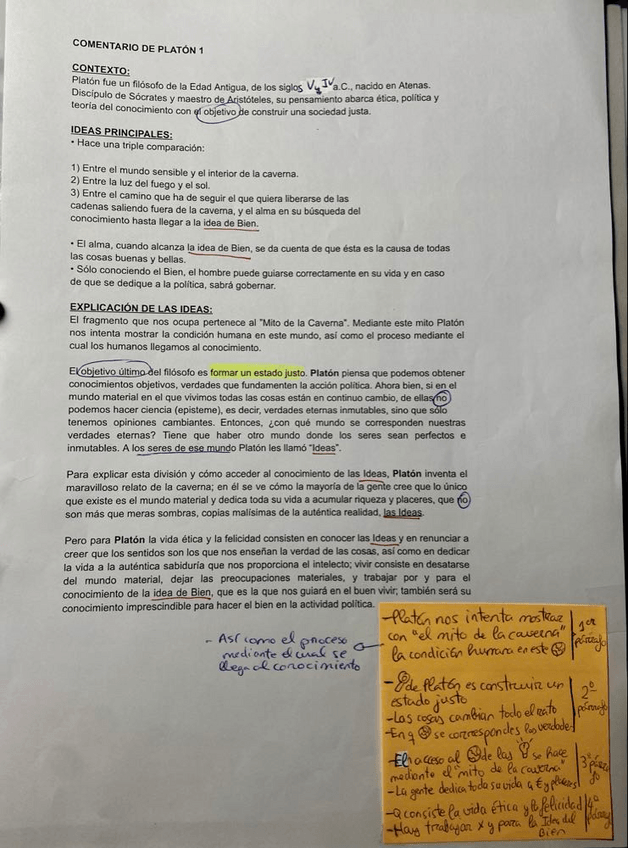 En estos apuntes aparece todo el contexto y la teoría de Platón (Bloque A de la PAU) para aplicarla en disertación comentario y preguntas de desarrollo. Espero que os sirva ?