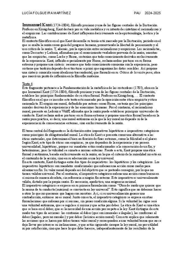 Resumen completo Immanuel Kant 2n de Bachillerato + Resumen de la moral de Kant, Hume, Descartes y Platón para el dilema de las PAU. Además, hay 3 referencias del libro NOESI (simbolismos de Kant).