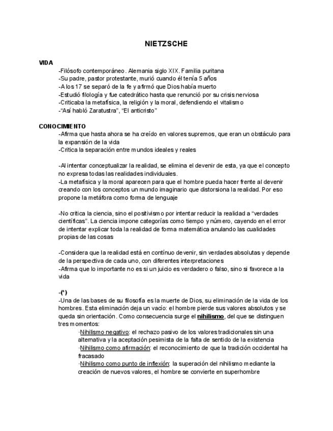Apuntes de 2ºBachillerato de filosofía, de FRIEDRICH NIETZCHE (filosofía contemporánea). Todos los posibles problemas desarrollados y su filosofía explicada para hacer la pregunta del texto también(Realidad/conocimiento, Metafísica/Dios, Antropología/ser