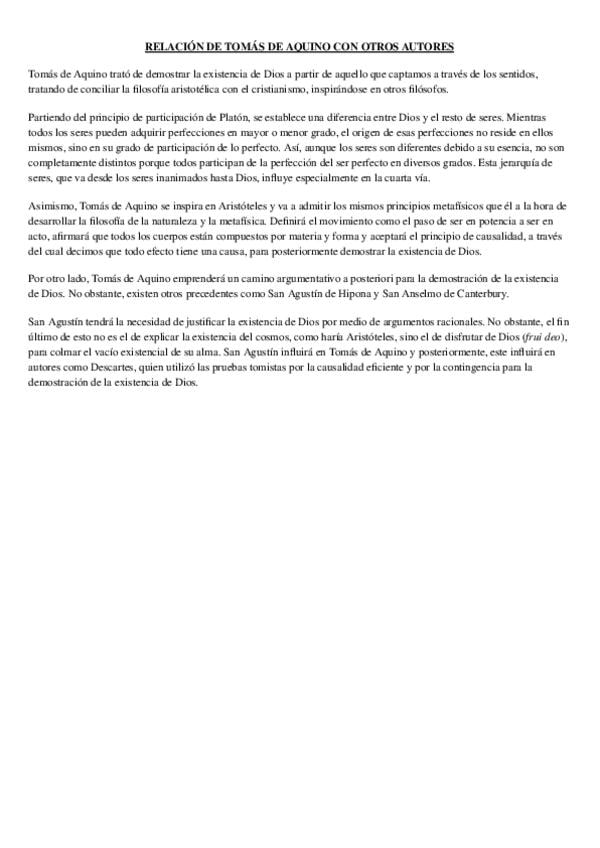 Comparativa de Santo Tomás de Aquino con Aristóteles. Sirve para la pregunta 2 de la EBAU o PAU. Con estos apuntes conseguí un 10 (MH) en la asignatura y un 9,75 en la prueba de acceso a la universidad.