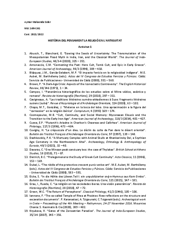 He publicado nuevos trabajos de 4º Historia de la Religión y del Pensamiento en la Antigüedad: Activitats Hist. Religió i Pensament AMS