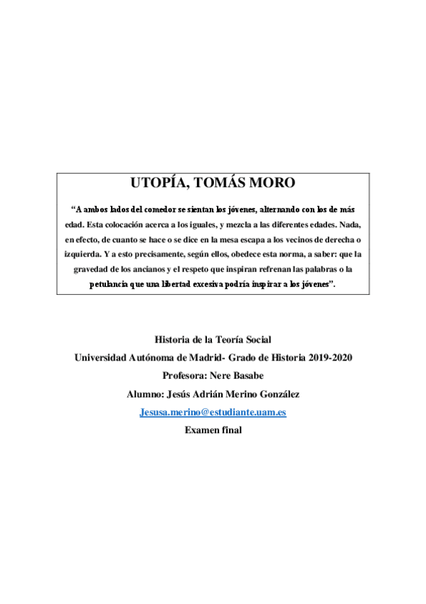 Examen de Teoría Social de la cita de Utopía de Tomás Moro (tb vale para los ensayos que se hacen a lo largo de la asignatura)