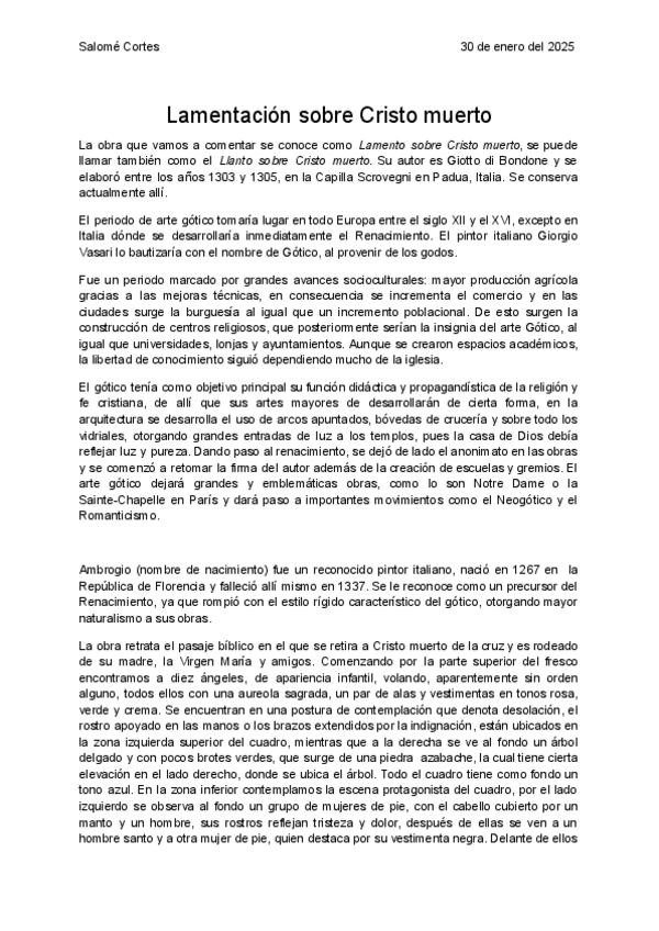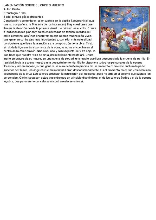 Comentario de texto tipo PAU, obra de Lamentación sobre Cristo Muerto de Giotto di Bondone, Tema: Gótico