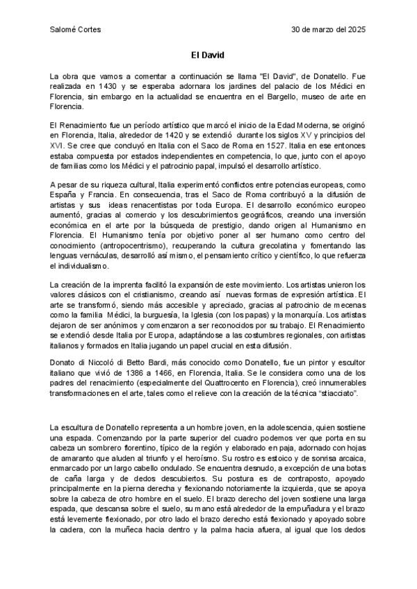 Comentario de texto tipo PAU del David del escultor Donatello, Tema: Renacimiento
