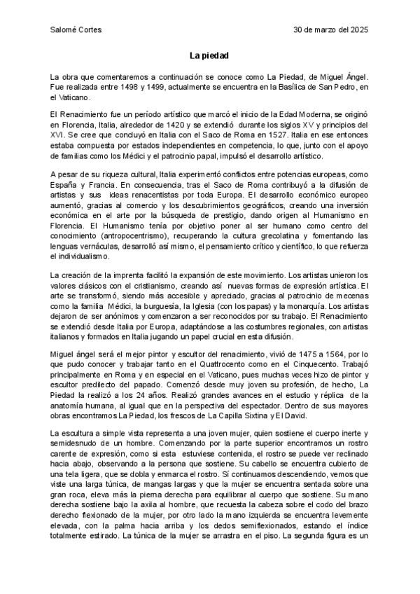 Comentario de texto tipo PAU de la Piedad de Migel Angel, Tema: Renacimiento
