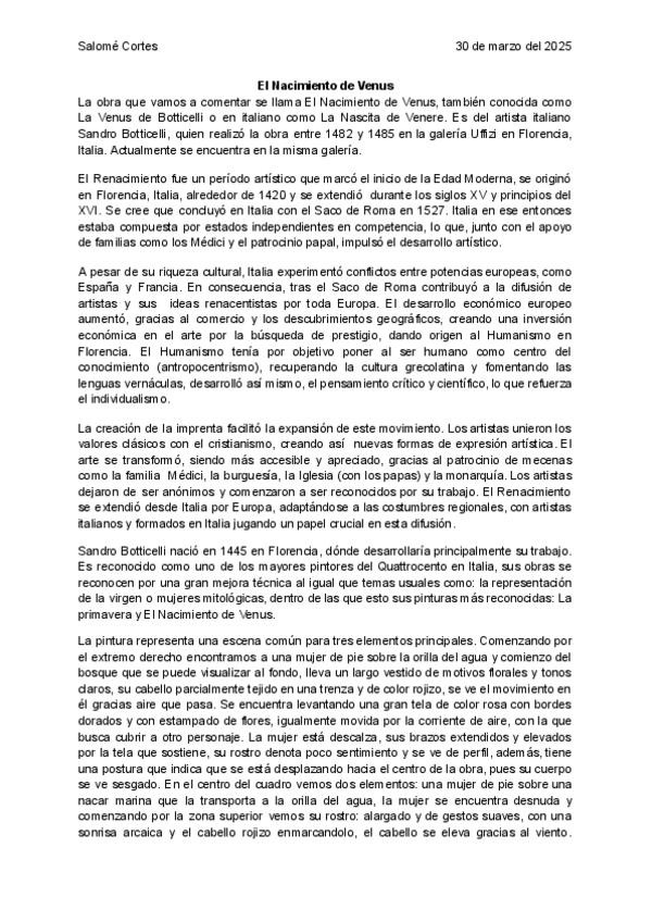 Comentario de texto tipo PAU, obra del Nacimeinto de Venus de Botticelli, Tema: Renacimiento