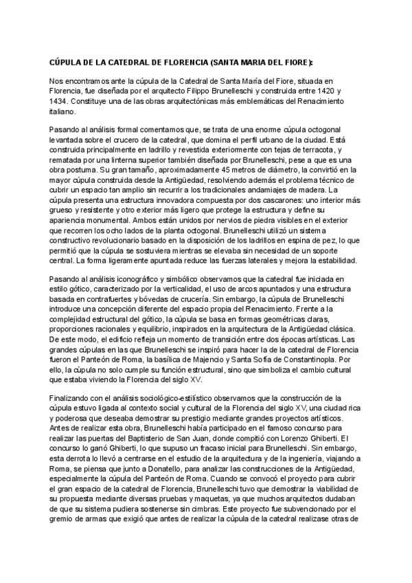 Comentario arquitectónico resuelto de la Cúpula de la Catedral de Florencia Santa María del Fiore de Brunelleschi para exámenes de historia del arte de 2 de bachillerato o PAU