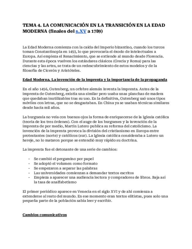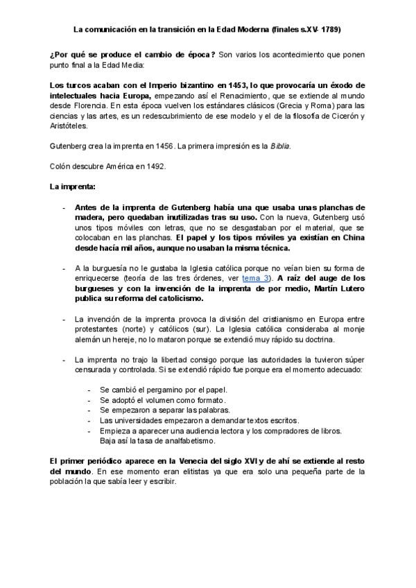 Apuntes del cuarto tema de Historia General de la Comunicación: La comunicación en la transición en la Edad Moderna (finales s.XV- 1789)