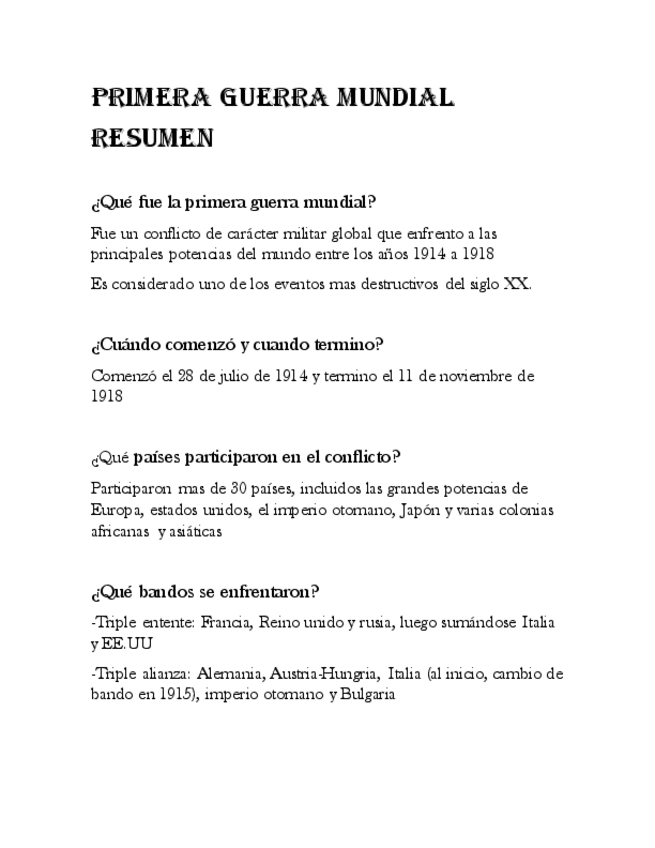 Resumen de la primera Guerra mundial, apunte con lo fundamental