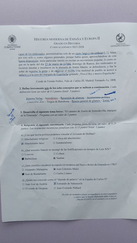 Examen de primera convocatoria (enero) de historia moderna II curso 25-26 Profesor: Francisco Javier Álvarez García