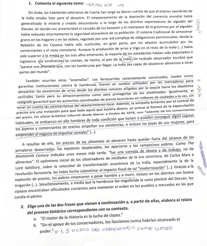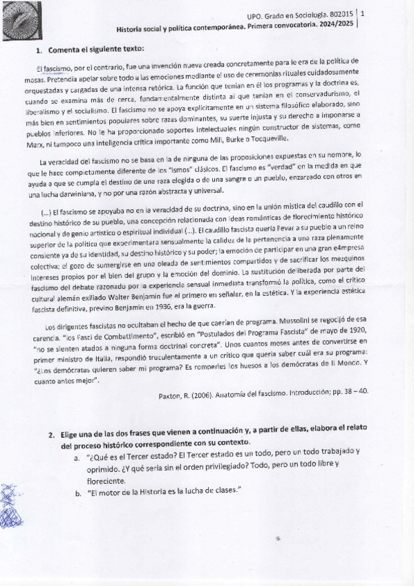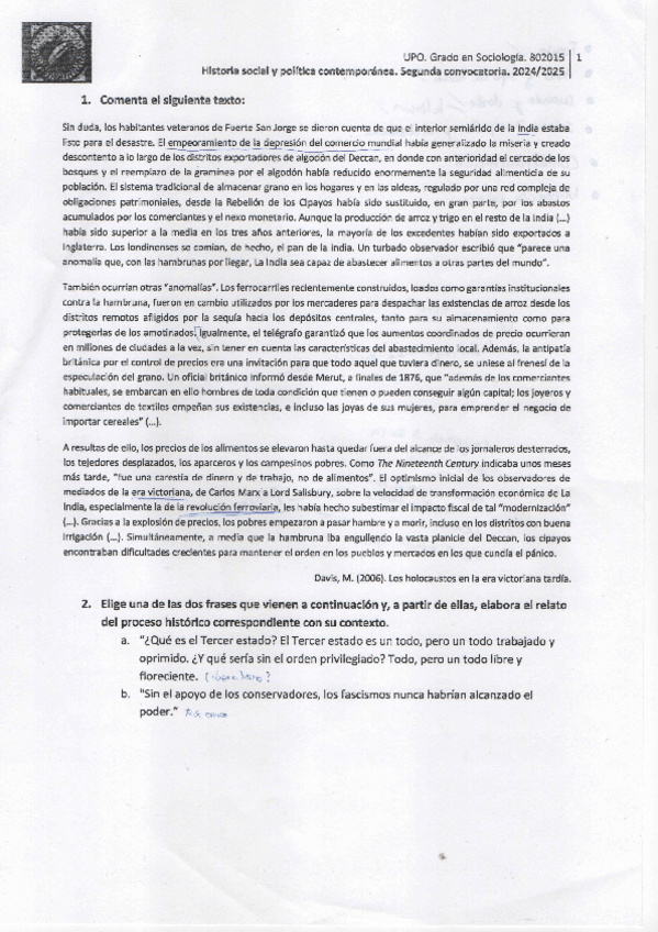 Examen de Historia Social y Política Contemporánea del curso 2020/21 con respuestas. Nota de 9´2/10.