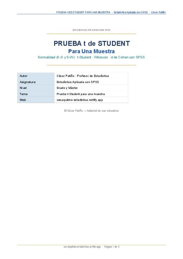 Guía completa de la Prueba t de Student para una muestra con SPSS. Incluye: normalidad previa (Shapiro-Wilk y K-S), tabla paramétrica vs no paramétrica, tipos de hipótesis (bilateral y unilateral), procedimiento paso a paso, intervalo de confianza al 95%,