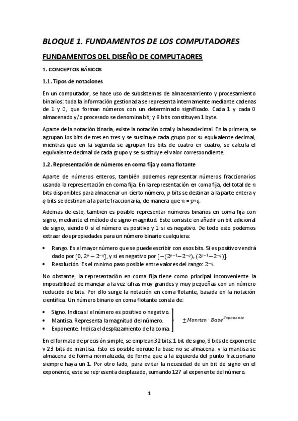 Apuntes del Bloque 1: Fundamentos de computadores. Temas: 2: Fundamentos del diseño de computadores; Tema 3: Fundamentos de sistemas operativos.