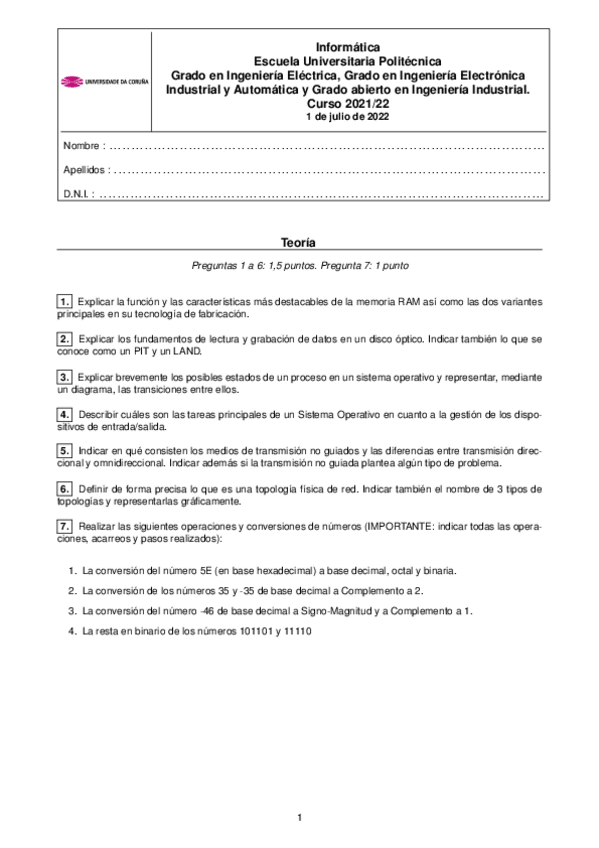 He publicado nuevos examenes de 1º Informática: ExaJulioElectricaElectronica21-22.pdf
