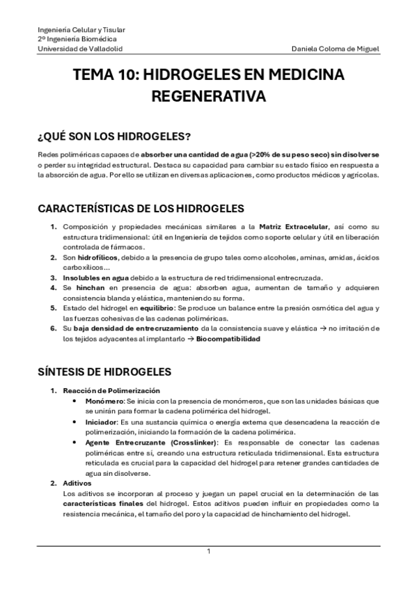 He publicado nuevos apuntes de 2º INGENIERÍA CELULAR Y TISULAR: T10. Hidrogeles en Medicina Regenerativa - Daniela Coloma.pdf