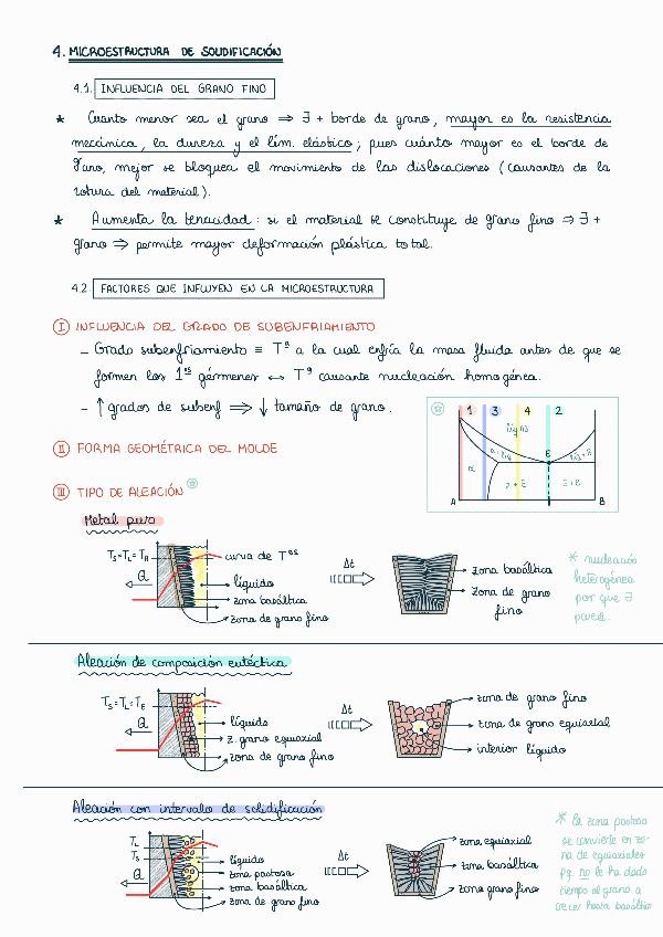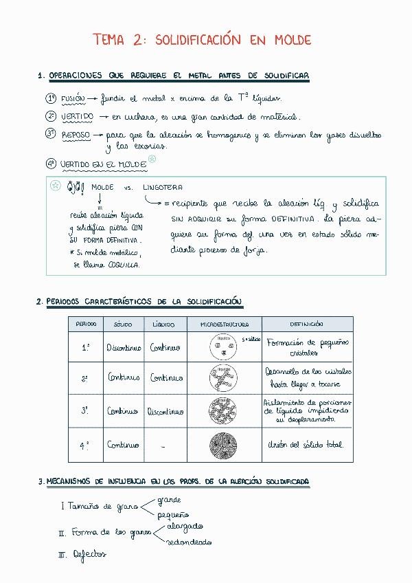 Apuntes teoría del tema 2: solidificación en molde. Con gráficos, ilustraciones, micrografías de los materiales, etc