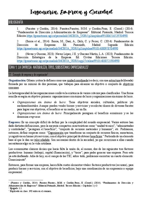 Apuntes del temario teórico del primer tema de Ingeniería, Empresa y Sociedad. Con todas las referencias, explicaciones de conceptos, y con toda la información de la Bibliografía dada (siguiendo la Guía) y las dispositivas de la profesora durante las clas