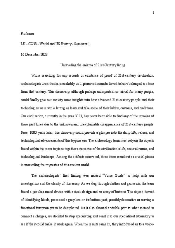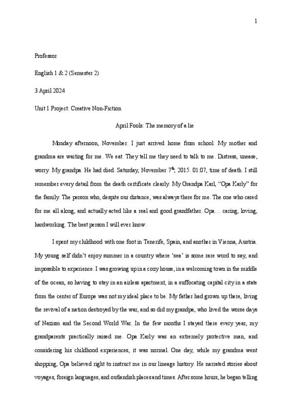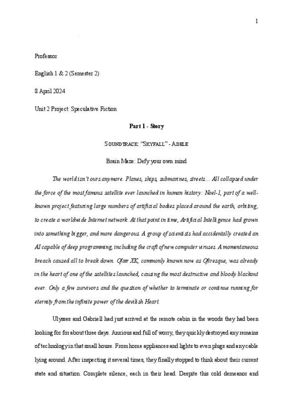 Compilación de trabajos de escritura avanzada que demuestran un dominio bilingüe del inglés. Incluye un ensayo de Ficción Especulativa sobre IA y el futuro, una pieza de No-Ficción Creativa sobre la memoria y el duelo, y un ejercicio de arqueología del fu