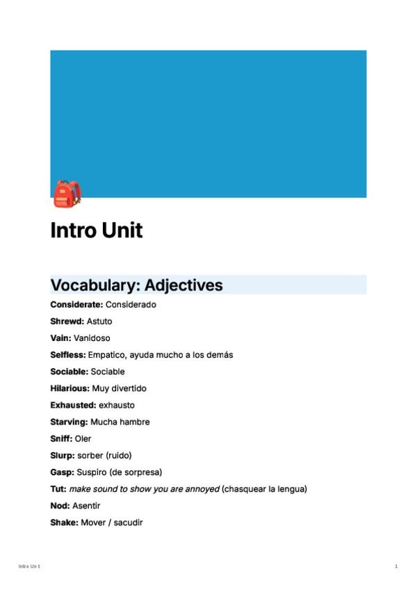 Hola, apuntes de ingles Intro Unit (Adjectives, Compound adjectives and nouns, phrasal verbs, present perfect, past tenses y Future forms.)