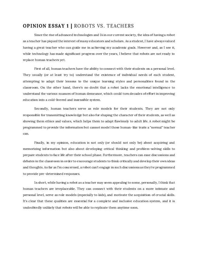 Dos modelos de "Opinion Essay" de nivel avanzado. El primero debate el papel de la IA en la educación frente a los profesores humanos, y el segundo analiza la eficiencia y adaptabilidad de los exámenes por ordenador. Ideal como guía de estructura y vocabu