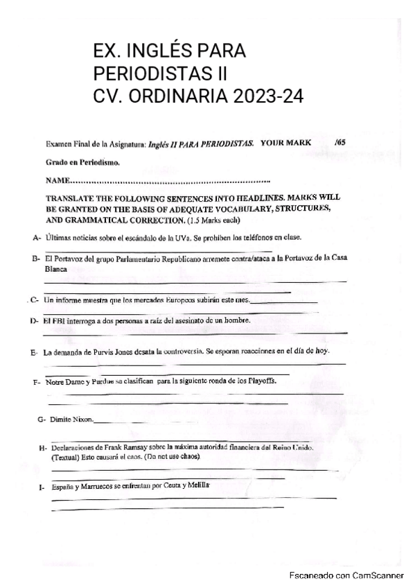 Examen de Inglés Para Periodistas II en la convocatoria ordinaria, impartida por Miguel Villalta Nieto en el grupo de mañana, en el curso 2023-24.